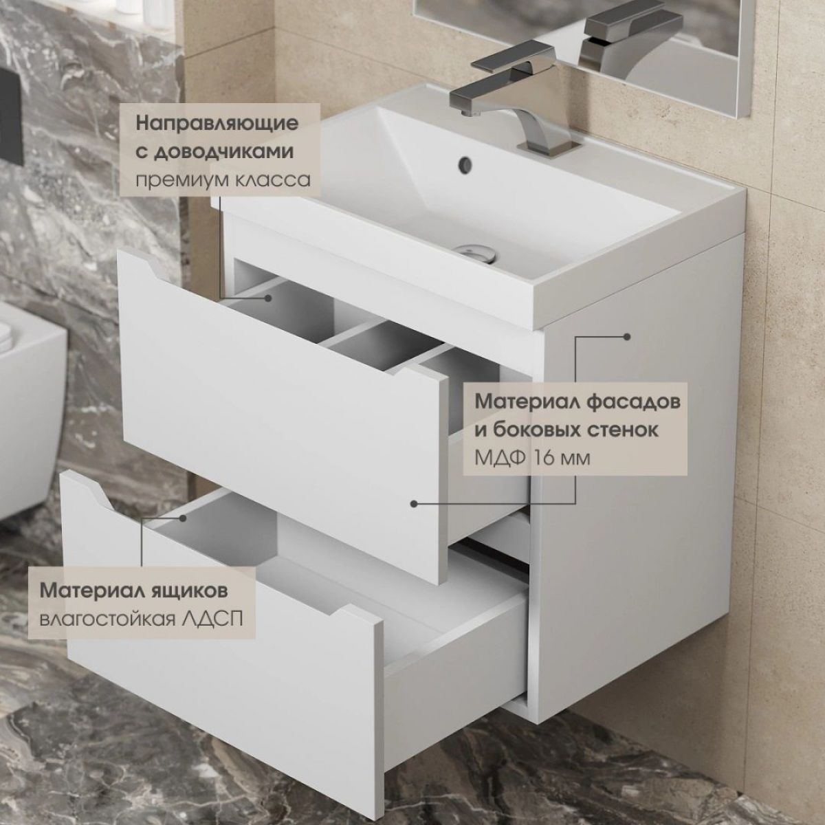Выдвижные ящики изготовлены из влагостойкой ЛДСП. Ящики оснащены доводчиками. Вся фурнитура и доводчики премиум-класса.